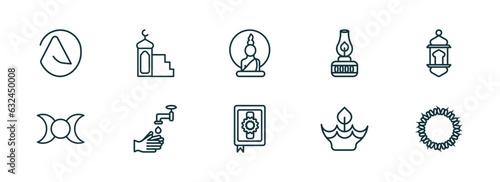 set of 10 linear icons from religion concept. outline icons such as atheism, minbar, buddha, mushaf, diwali, crown of thorns vector
