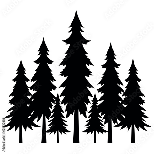 Set of 10 scratchy rough pine tree silhouettes isolated on white background