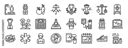 set of 24 outline web healthy life icons such as shower, water, vegetables, life insurance, medal, dumbell, weight vector icons for report, presentation, diagram, web design, mobile app