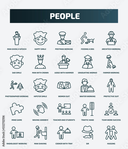 set of 25 special lineal people icons. outline icons such as man giving a speech, happy smile, architech working, judge with hammer, photographer working, waiter working, waving goodbye, team work