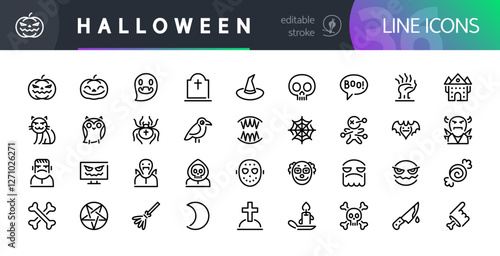 Set of 36 Halloween Line Icons with Editable Stroke. Suitable for web, infographics and apps. Isolated on white background.