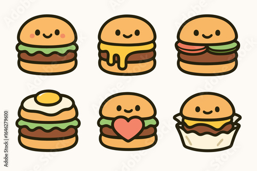 Set of 6 cute cartoon burger icons with colorful and playful designs on white background. Perfect for menus, branding, and fun food illustrations