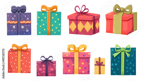 set of A stack of colorful wrapped gift boxes isolated on transparent background, illustration. Design element for Christmas card, Christmas greeting card, anniversary card. Invitation card.