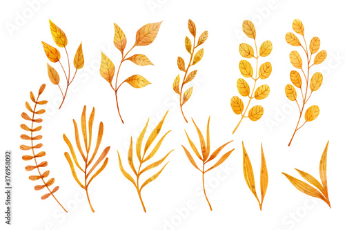Set of autumn herbs and leaves. Watercolor illustration isolated on white.