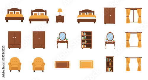 Set of Bedroom and Living Room Furniture with Beds Wardrobes Chairs and Shelves in Warm Colors