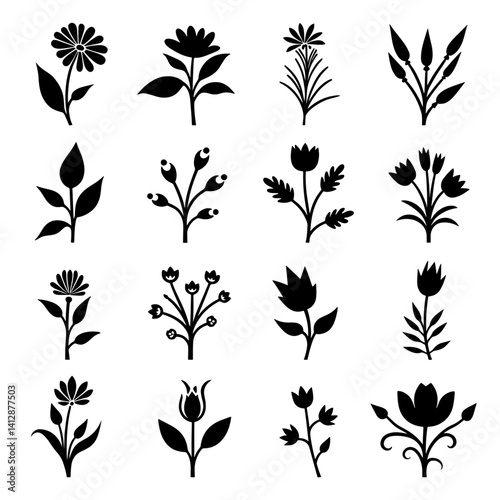 Set of black and white flowers, Set of floral elements, Set of black silhouettes of flowers on white background, set of black and white flowers
