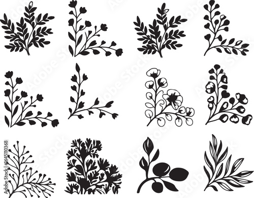 Set of Black and White Silhouette Floral Branches and Leaves - Vector Illustrations