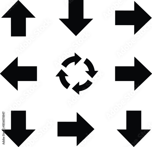 Set of black arrow icons including up, down, left, right directions and circular reload symbol isolated on white background for web design, navigation, interface, and graphic projects.