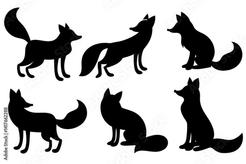 Set of black silhouettes of fox on transparent background