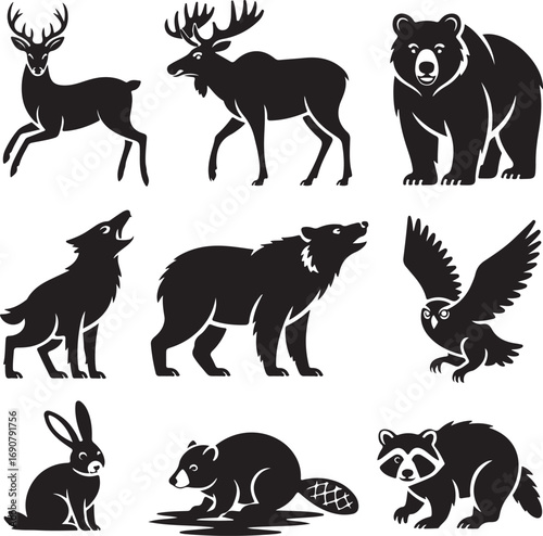 Set of Black Silhouettes of North American Forest and Woodland Animals Keywords: deer, elk, moose