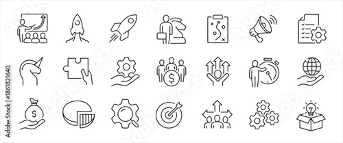 Set of Business and Strategy Line Icons Collection Vector Isolated on White Background Such as Achievement, Startup, Launch, Development, Planning, Target, Success and More 200
