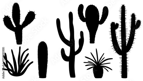 Set of cactus silhouette vector illustrations. Includes various cactus shapes in black on a white background. Ideal for desert, botanical, or nature-themed design projects.