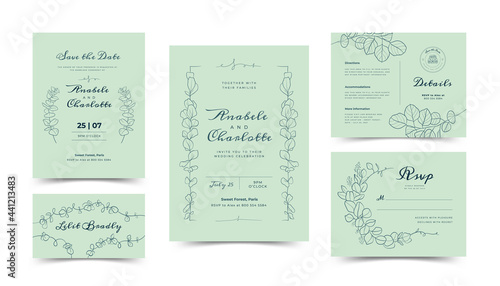 Set of card with line art leaf and brunch. Wedding ornament concept. Floral poster, invite. Vector decorative greeting card, invitation design background