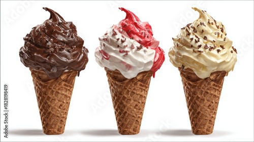 set of Chocolate, vanilla and strawberry splash of Ice cream cone flavor with clipping path, 3d, dessert, sweet, food, ice cream, delicious, gen by AI