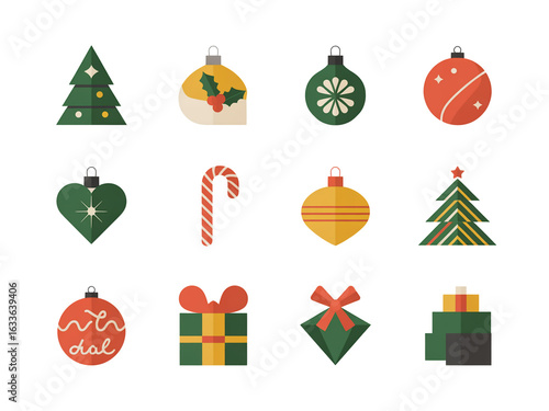 Set of christmas ornaments and decorations isolated on white background in retro pixel style for holiday season and new year celebration
