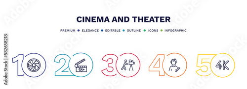 set of cinema and theater thin line icons. cinema and theater outline icons with infographic template. linear icons such as camera lens, plus 18 movie, cameraman, author, 4k vector.