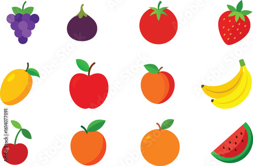 Set of Colorful fruits vector. Editable eps file illustration Apple, Bananas, Cherry, Fig, Grapes, Kiwi, mango, Nectarine, Orange, Strawberry, Tomato, Watermelon