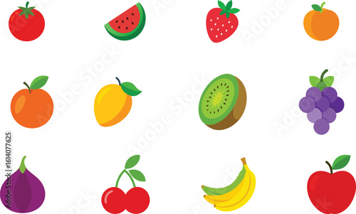 Set of Colorful fruits vector. Editable eps file illustration Apple, Bananas, Cherry, Fig, Grapes, Kiwi, mango, Nectarine, Orange, Strawberry, Tomato, Watermelon