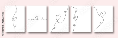 Set of continuous line hand drawn hearts greeting cards with flourishes