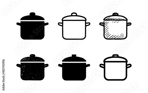 Set of cooking pot icons with various line styles for kitchen design