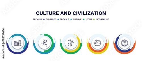 set of culture and civilization thin line icons. culture and civilization outline icons with infographic template. linear icons such as bo kaap, native american axes, native american drum, corn with