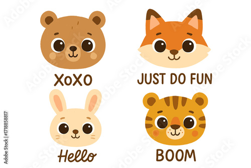 Set of cute animal heads with text quotes. Kawaii bear, fox, rabbit, tiger characters in flat style. Big eyes faces for baby nursery decor, kids print, poster, stickers.