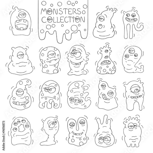 Set of cute monsters and aliens with many eyes. Cartoon funny doodle monster collection. Hand drawn vector for kids. All objects grouped and isolated on white.