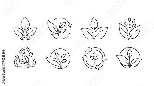 Set of eight hand-drawn organic and recycling icons with leaves and sprouts silhouette
