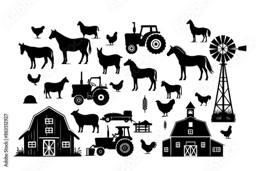 Set of farm life silhouette vector depicting agriculture and rural scenes. Includes barn, tractor, crops, livestock, and family. Black and white icons of countryside nature, architecture, and agrarian