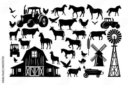 Set of farm life silhouette vector depicting agriculture and rural scenes. Includes barn, tractor, crops, livestock, and family. Black and white icons of countryside nature, architecture, and agrarian