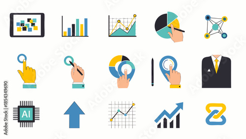 Set of Flat Icons Representing Data Analysis, Business Growth, Technology, and Strategy