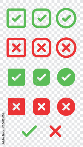 Set of green check marks and red X marks in various shapes. Check marks and X marks for approval and rejection. Symbols for correct and incorrect choices. Vector element set.