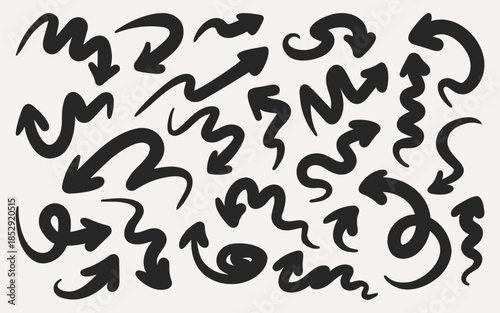 Set of hand drawn curve arrows. Abstract marker pointers. Funny highlighting doodle elements.