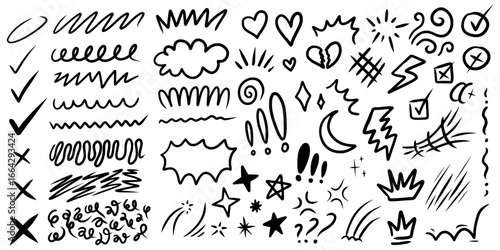 Set of hand-drawn doodle elements in a black ink style. Big collection of sketchy scribbles, arrows, hearts, and comic symbols.