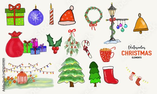 Set of hand-drawn Watercolor Christmas Elements Clipart set