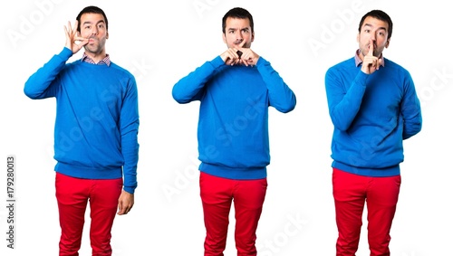 Set of Handsome young man making silence gesture