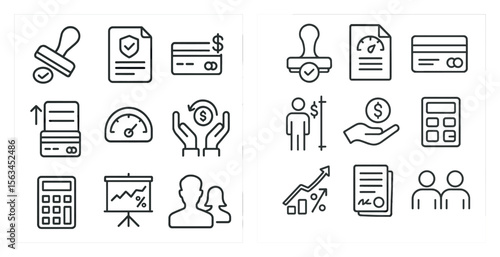 Set of icons for finance and business. The icons include a calculator, a credit card, a check, a ruler, a person holding a check, a person holding a credit card, a person holding a calculator