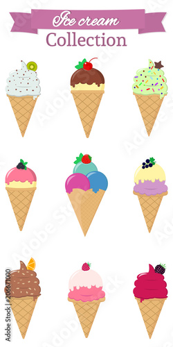 Set of nine different sweet ice cream on white background and pink ribbon with text. Flat style, vector illustration.