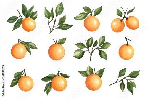 Set of orange with leaves isolated on white background