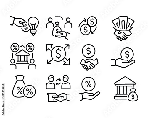 Set of outline icons related to loan, lending, credit. Linear icon collection