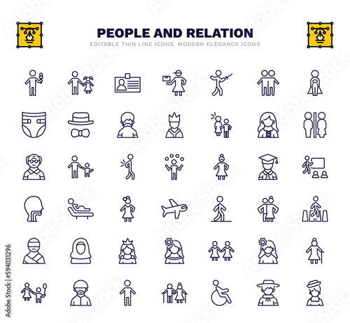 set of people and relation thin line icons. people and relation outline icons such as foreign reporter, identification ard, fencing attack, norwegian, juggling ball, birth, road crossing, no racism,