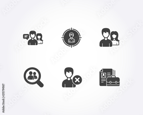 Set of Remove account, Headhunting and People talking icons. Teamwork, Search employees and Vacancy signs. Delete user, Person in target, Contact service. Man with woman, Staff analysis, Hiring job