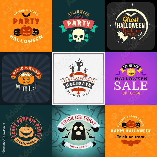 Set of Retro Happy Halloween Badges. Design Element for Greetings Card or Party Flyer. Vector Illustration. Halloween Posters Set.