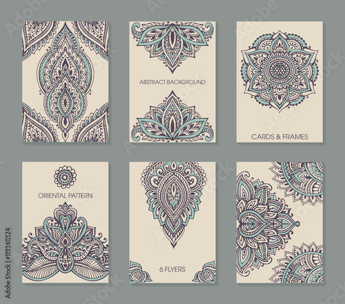Set of six cards or flyers with abstract henna mehndi ornament.