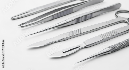 Set of stainless steel surgical instruments on a white background. Close-up of medical tools including forceps, scalpels, and scissors for a sterile procedure. Healthcare and medicine concept
