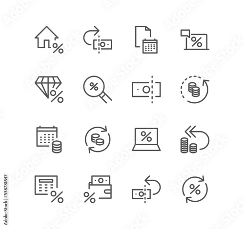 Set of tax and finance icons, tax refund, paper money, cash, growth, money report, market, interest rate and linear variety vectors.
