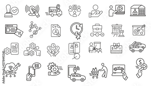 Set of thin line icons related to team, teamwork, co-workers, and cooperation.. Linear business simple symbol collection. Business training and office collection. Big UI icon set. Thin outline pack.