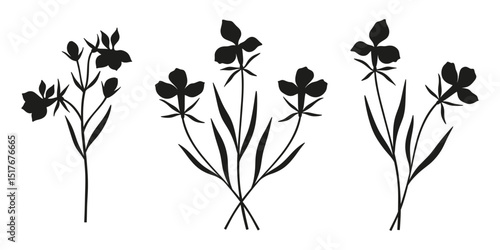 Set of three bouquet silhouettes of exotic flowers. Bunches of blooming perennial wild plants with leaves, minimal style. Botanical hand-drawn elements for design projects. Vector illustration