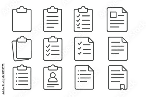 Set of various document and clipboard icons with editable thin stroke, checklist, profile, notes, papers, and file symbols for web, app, book, card design, vector illustration