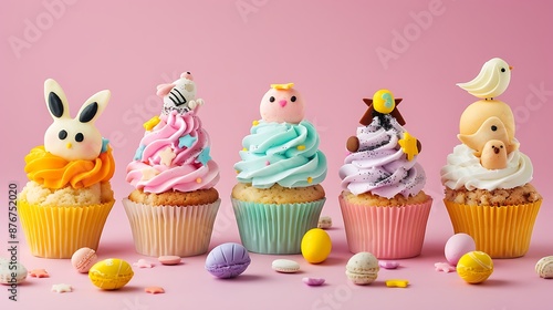 Set of various funny Easter cupcakes decorated for kids on pink background